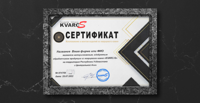“KVARC-S” поставляется в слэбах размером 3050мм x 1440мм и 3200мм x1600мм, толщиной 15мм и 20мм. Широкая палитра, которая будет пополнятся с каждой новой партией. Наша палитра цветов, удивят каждого. Кварцевый камень “KVARC-S” имеет Сертификат Качества Национальной систему сертификации Республики Кыргызстан, протокол испытания, протокол радиологической лаборатории и Санитарной Эпидемиологическое Заключение.